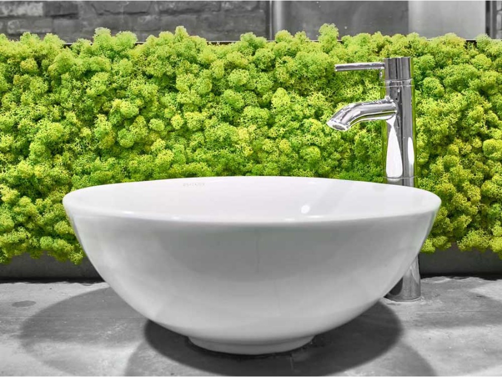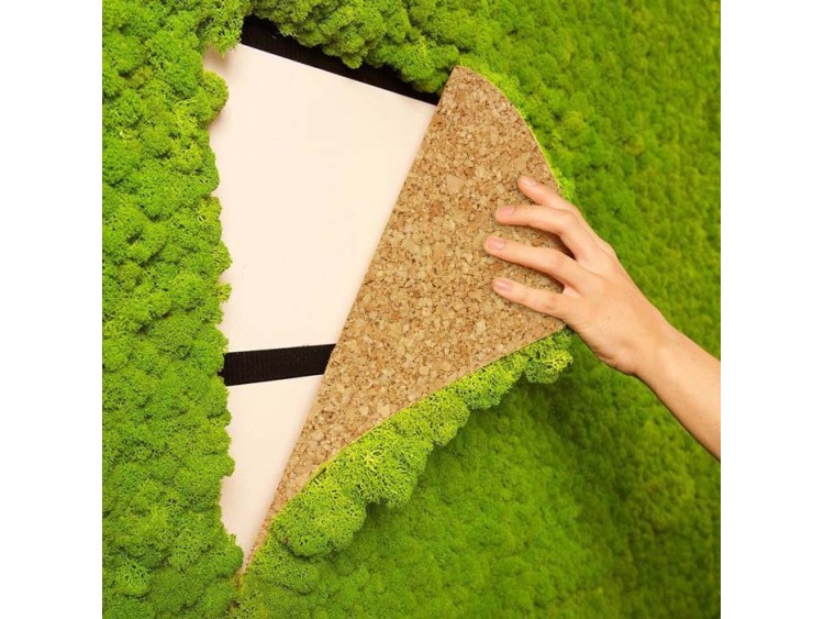 Panel z mchu chrobotka na płycie wilgocioodpornej. Wykonany ręcznie z wysokiej jakości materiałów. Barwiony mech dekoracyjny (porost leśny) w żywym, zielonym kolorze jest pozyskiwany 100% w zgodzie z naturą z legalnych, zagranicznych plantacji. Jest to produkt całkowicie naturalny, a swój kolor zawdzięcza użyciu naturalnych barwników. Dzięki procesowi utrwalania jest produktem, który nie usycha, nie pleśnieje, nie wymaga podlewania, dostępu do słońca, przycinania, ani żadnej innej pielęgnacji.