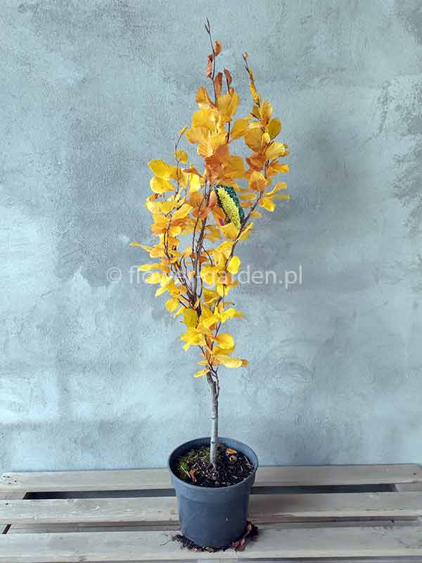 Odmiana buka zwyczajnego o smukłej, wąskiej koronie i złotych liściach. Rośnie silnie, osiągając w wieku 10 lat około 5 m wysokości oraz 1 m szerokości. Starsze egzemplarze mogą dorastać do wysokości powyżej 10 m. Pędy sztywne, wyprostowane, na szczycie delikatnie przewieszające się. Kora gładka, szara. Liście jajowate, błyszczące, delikatnie owłosione. Wiosenne przyrosty jasnozielone, a letnie żółto-złociste, opadają na zimę, ale długo utrzymują się na krzewie. Zimą w okresie bezlistnym walory dekoracyjne ujawnia kolumnowy pokrój drzewa i liczne, wzniesione pędy. Jedna z najpiękniejszych kolumnowych odmian buka, polecana do sadzenia w dużych ogrodach, parkach, w pobliżu zbiorników wodnych, jako drzewo alejowe, do tworzenia kompozycji z innymi drzewami i krzewami, oraz jako soliter w eksponowanym miejscu. Żółte liście ładnie kontrastują na tle nieba i zielonego krajobrazu.