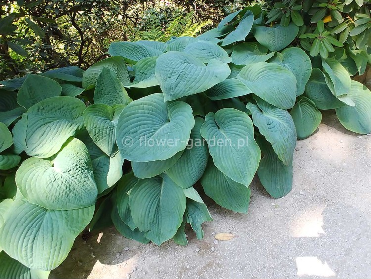 Wieloletnia bylina o ozdobnych liściach. Tworzy gęste kępy o wysokości 50-70 cm i nieco większej szerokości. Główną ozdobą rośliny są duże, sercowate liście o stalowo-zielone barwie, pokryte woskowym nalotem. Na stanowisku słonecznym ich kolor jest bardziej niebieskawy, a na stanowisku zacienionym bardziej zielonkawy. W lipcu i sierpniu pojawiają się kwiaty skupione w kwiatostany na długich, prostych łodygach, wystających ponad liśćmi. Kwiaty mają lejkowaty kształt i białą barwę. Odmiana polecana do sadzenia w grupach po 2-3 sztuki, jako roślina okrywowa, do obsadzania miejsc zacienionych (np. pod dużymi krzewami i drzewami), na rabaty, a także do tworzenia kompozycji naturalistycznych. Gęstość sadzenia: 3 szt./m2.