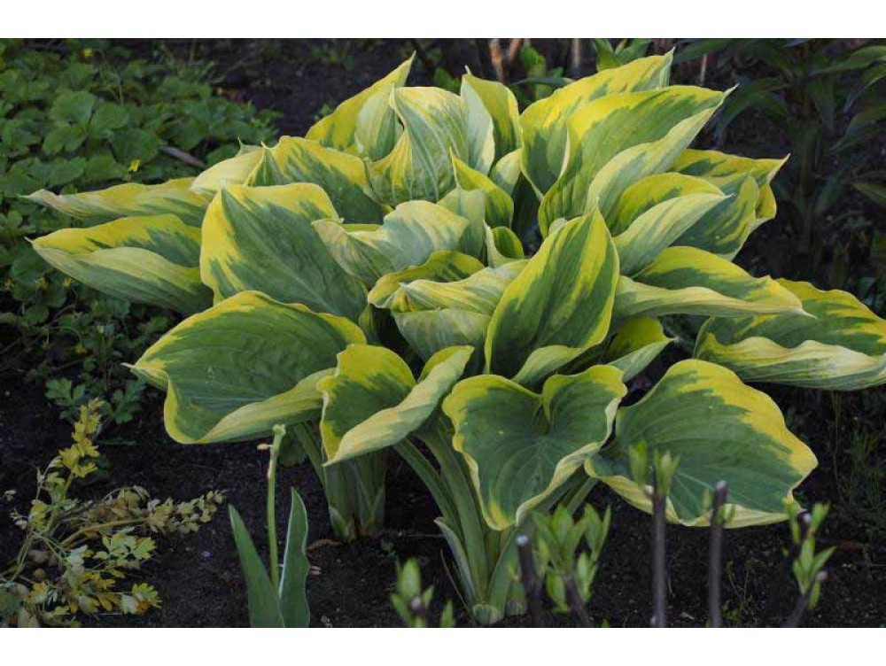Wieloletnia bylina o ozdobnych liściach. Odmiana osiągająca ok. 90 cm wysokości i mniej więcej taką samą wysokość. Główną ozdobą rośliny są duże, sercowate, oliwkowozielone liście ze złocistym brzegiem zajmującym znaczną część liścia. W lipcu i sierpniu pojawiają się kwiaty skupione w kwiatostany na długich, prostych łodygach. Kwiaty mają dzwonkowaty kształt, są lawendowe. Odmiana polecana do nasadzeń grupowych, jako roślina okrywowa, do obsadzania miejsc zacienionych (np. pod dużymi krzewami i drzewami), na rabaty, a także do tworzenia kompozycji naturalistycznych. Zaleca się sadzenie w grupie po 2-3 sadzonki. Gęstość sadzenia: 2-3 szt./m2.