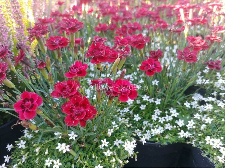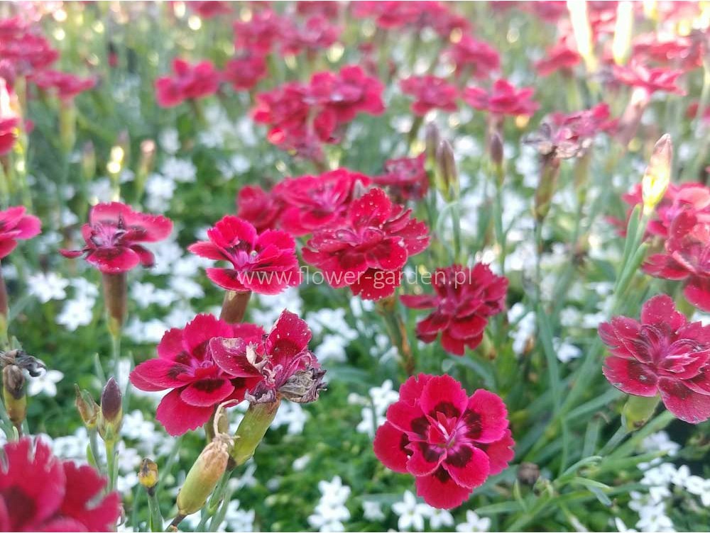 Wieloletnia niska bylina o efektownych kwiatach. Tworzy zwarte, poduszkowate kępy, o wysokości nie przekraczającej 25 cm i szerokości 20 cm. Liście wąskie, barwy niebieskawo-zielonej. Kwiaty krwistoczerwone, pełne, postrzępione na brzegach, ciemniejsze w środki, jaśniejsze na brzegach. Są osadzone na długich łodyżkach i pojawiają się w dużych ilościach w lipcu i sierpniu. Goździk ten oferowany jest razem z izotomą - efektowną rośliną okrywową o drobnych, białych kwiatach. Posadzone są razem w jednej doniczce tworząc ciekawy efekt.