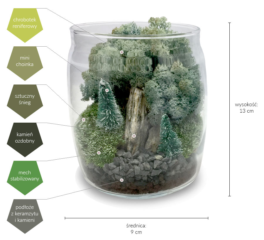 Aranżacja w słoikach z tej serii zawiera dodatkowe elementy, takie jak sztuczny śnieg, mini drzewka choinkowe oraz mech chrobotek barwiony na wyjątkowy, niebiesko-zielony kolor. Szczególnie polecamy jako wyjątkowy i oryginalny prezent pod choinkę lub ciekawą ozdobę w klimacie zimowym.