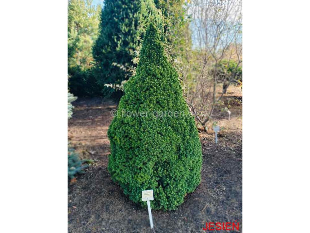 Wolno rosnący krzew o stożkowym pokroju, podobny do odmiany ‘Conica’. W wieku 10 lat osiąga około 0,8 m wysokości. Jego największą ozdobą jest złoty kolor igieł, pojawiający się wraz z wiosennym przyrostem. Wiosenna żółta barwa krzewu utrzymuje się aż do czerwca. Drugi, letni przyrost jest jasnozielony.