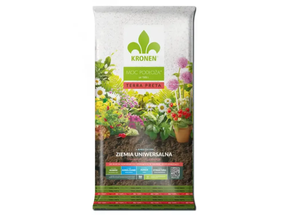 KRONEN® TERRA PRETA ziemia uniwersalna do roślin ogrodowych i domowych w gruncie i w pojemnikach jest przeznaczona do sadzenia i przesadzania wielu gatunków roślin zielonych i kwitnących, warzyw, ziół, bylin, iglaków w domach na balkonach, tarasach i w ogrodach (z wyjątkiem roślin kwaśnolubnych). Ma wiele zalet dla roślin i dla środowiska. BEZ TORFU